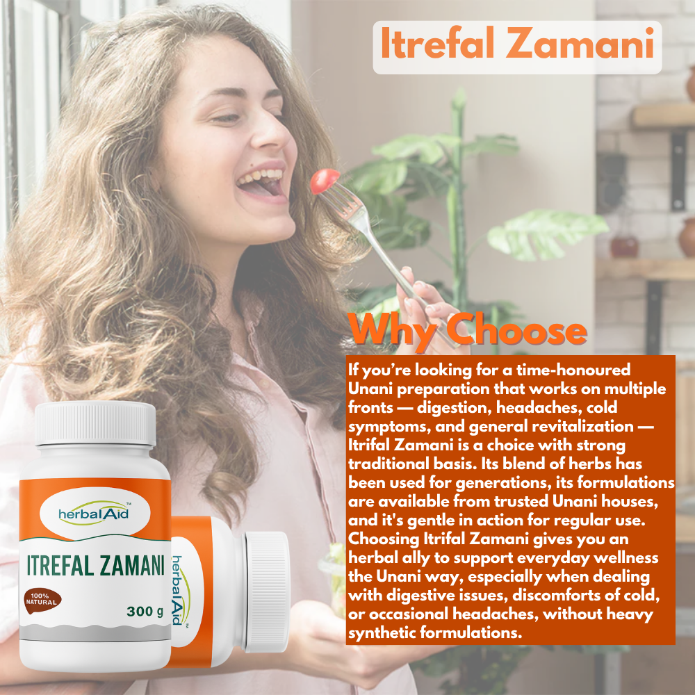 Itrifal Zamani is a classical Unani formulation known for its effectiveness in treating chronic catarrh, headache, migraine, dizziness, colic, and melancholia. It provides gentle relief from constipation and helps soothe nervous disorders, promoting overall body balance and calmness.