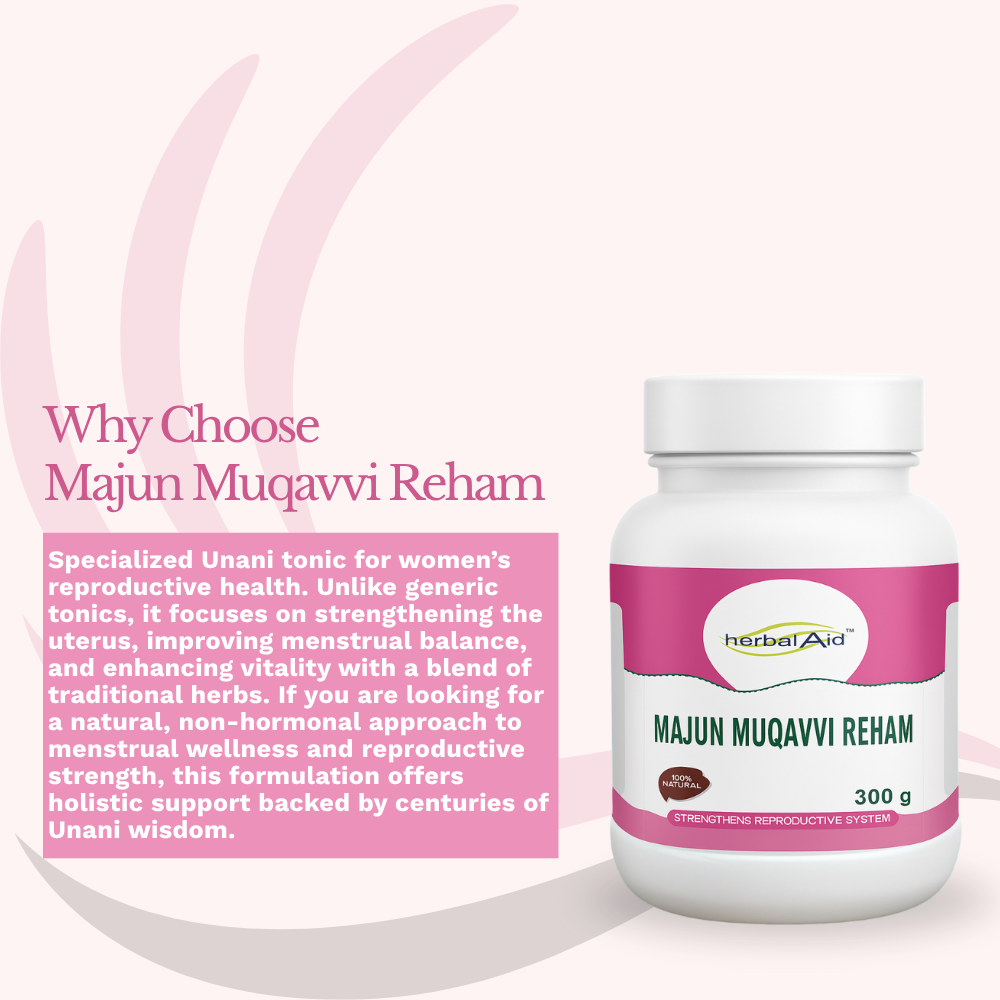 Majun Muqavvi Reham is a time-tested Unani formulation specially designed to strengthen the uterus and enhance overall female reproductive health. It helps regulate uterine functions and provides relief from conditions arising due to uterine weakness. This herbal tonic is beneficial in leucorrhoea (white discharge), recurrent miscarriages, and premature deliveries. Regular use supports hormonal balance, improves uterine tone, and promotes reproductive wellness naturally.